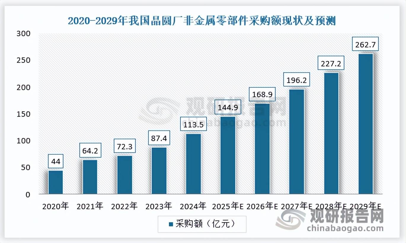 2020-2024年我国晶圆厂非金属零部件采购额从44亿元增加至113.5亿元,市场规模稳步扩容,我国晶圆厂陶瓷零部件采购额将增至69.7亿元,